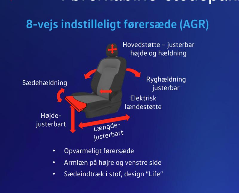 Udvalgt standard udstyr på e-Transporter Comfort: * 2x USB-data-/opladningsporte 15 W i instrumentpanelets midterkonsol 1x USB-C, 1x USB-A * 4 højttalere (2 højttalere i instrumentpanelet og 2 højttalere i førerkabinedørene * Airconditionanlæg i førerkabinen (1 zone med autom. regulering) * Digitalt cockpit * Fartpilot med intelligent hastighedsassistent * Fjernlysreguleringen ”Light Assist” * Nøglefrit startsystem "Keyless Start” uden SAFE-låsning * Parkeringshjælp foran og bagpå * Radio 33 cm (13") med touchfarvedisplay og trådløs App-Connect (Apple & Android) * Sædevarme til sæder i førerkabinen, separat indstilling * Varmepumpe til optimering af rækkevidden * Vejskiltegenkendelse og spøgelsesbilistadvarsel * 2 LED-lamper i varerummets/passagerkabinens loftbeklædning * 6-vejs førersæde, indstilleligt * Armlæn til førersæde * Dobbelt passagersæde med underlæssefunktion og klapbord * LED-lamper i førerkabinen * Manuel 2-vejs lændestøtte til førersædet * Midterkonsol, smal med drikkevareholder og opbevaringsrum til mobiltelefon * Panelliste til skydedør i sort kunststof * Sidebeklædning af kunststof i passagerkabinen/varerummet, halvhøj * Forberedelse til VW Connect og VW Connect Plus * 4-vejs hovedstøtter, kan indstilles i højden og hældningen * 8 fastgørelsesøjer til sikring af bagage/last i varerummet * Airbag til fører og forsædepassager, med frakobling af forsædepassagerens airbag * LED-baglygter * LED-forlygter inklusive LED-dagskørelys * Multifunktionsrat * Nødbremseassistent med fodgænger- og cyklistregistrering med undvigeassistent og drejeassistent * Nødopkaldssystemet eCall * Vognbaneassistenten ”Lane Assist”