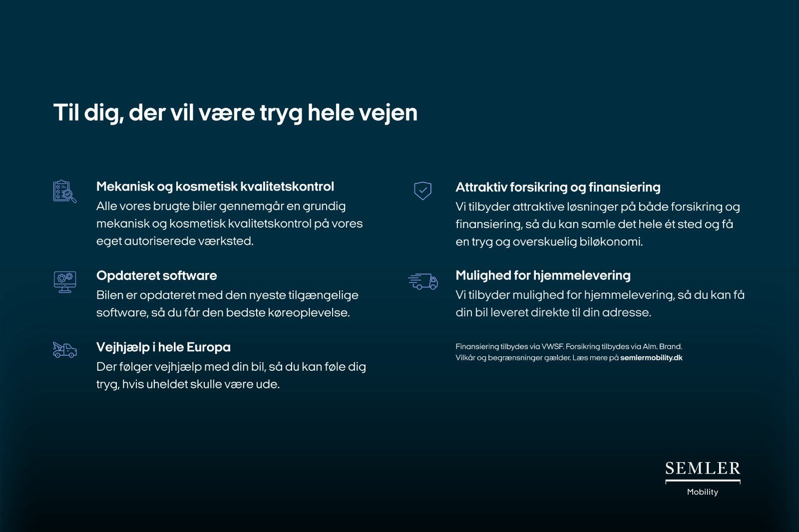 * Forudsætter køb af Clever One m./u. standardinstallation af ladeboks hos Semler Mobility Retail A/S. Fortrydelsesret på Clever One abonnement gælder. Mindstepris i bindingsperiode (6 mdr.): 0 kr. Tilbagebetaling: Udregnes som dit kWh-forbrug x gns. strømpris pr. kWh i DK mellem kl. 24-06 i md. og udvides i april-sept. m. kl. 11-17. Læs mere: clever.dk/tilbagebetaling. Gælder kun ved køb af en brugt elbil fra Audi hos Semler Mobility Retail A/S i perioden 28.3.26 - 30.4.26.